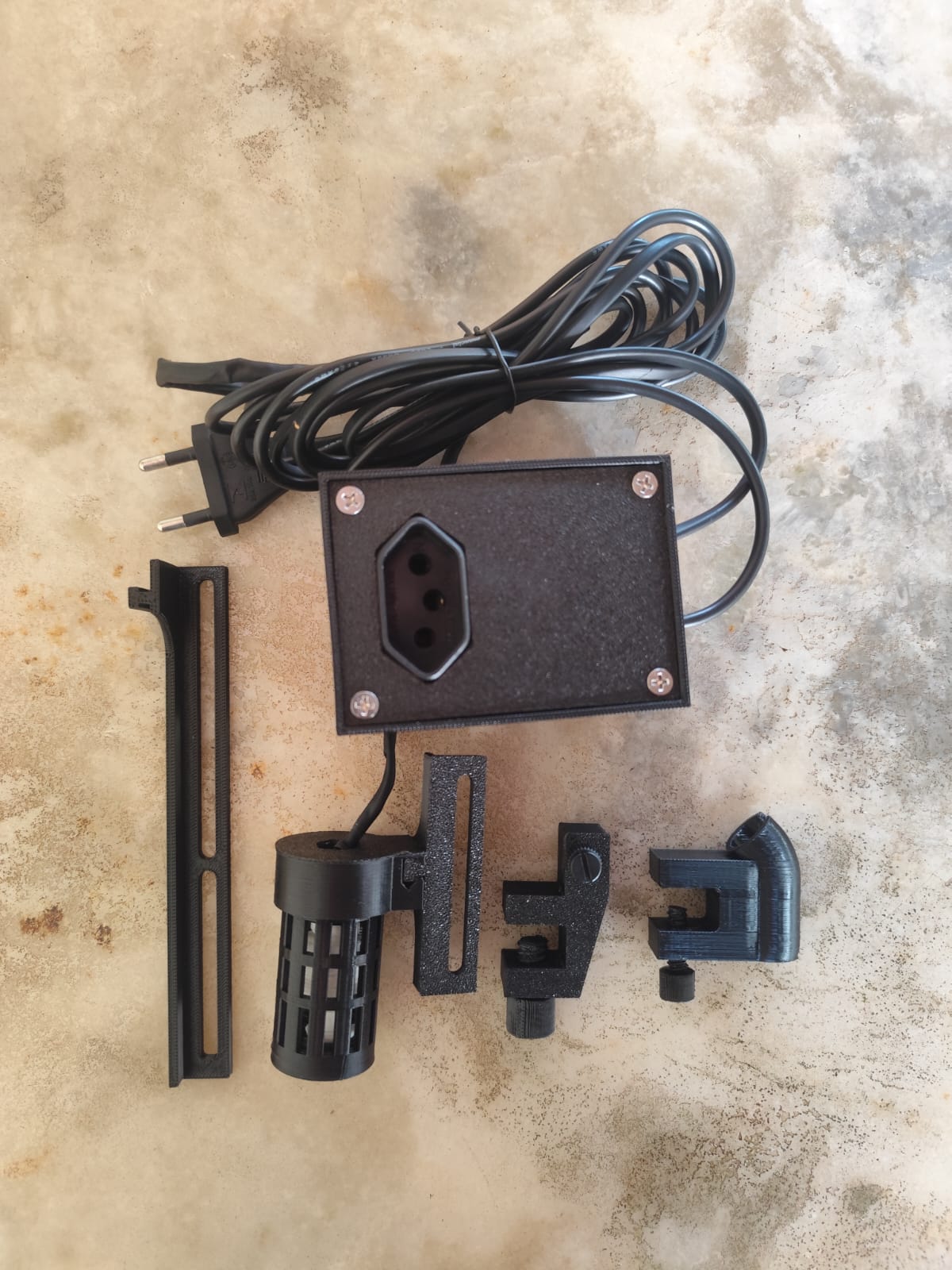 1 - Fixar o suporte regulável na borda do aquário, regular a altura desejada (nível de água batendo no suporte horizontal das boias – imagem acima), depois de ajustar o nível, aperta o parafuso de fixação.